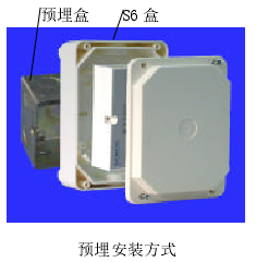 预埋布线方式:把 S6 型模块盒用 4 个 M4×50 自攻螺钉固定在墙上,墙上事先安 4 个(间距 106×106 mm)膨胀塞子。接线利用预埋盒(市售H86 型或本公司 ZA1911 型,需另行定货)和模块底部的接线孔。